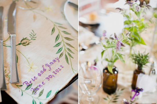 One of the most heartfelt DIY projects was done by Brie?s mom. She made all the table runners ? one side was burlap and the other side was a burlap colored cotton with dark green vines and an occasional white flower with their names and date embroidered.