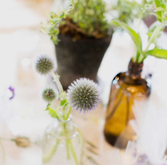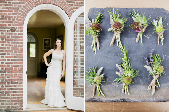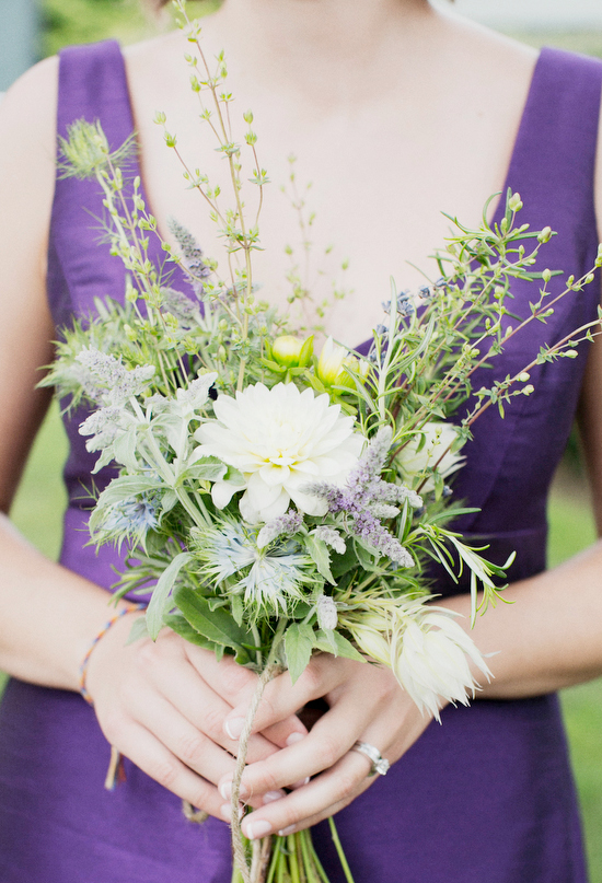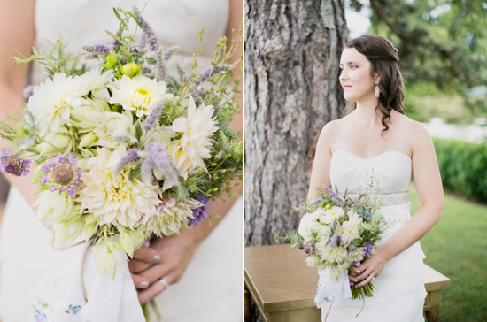 The florist, Fox Fodder Farm?used nigella, lavender, lamb?s ear, queen ann?es lace, peonies/dahlias, and some cornflower in Brie?s bridal bouquet. She wanted a bouquet that looked like she had just walked through a field of flowers and picked a few to carry down the aisle.
