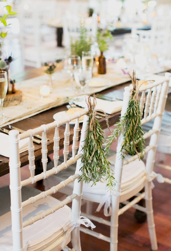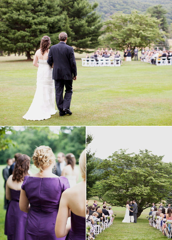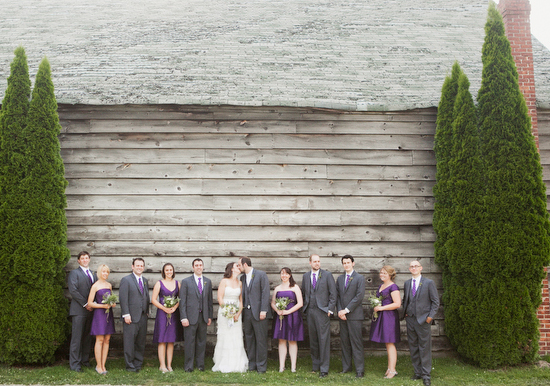 Brie found it a little difficult to focus on one theme so she kept looking for words or moments to be inspired by. She knew she wanted the wedding to be an elegant and timeless event, knew she liked the color purple, and that she wanted it to look a little vintage and have a relaxed, natural vibe to it. So she drew inspiration from Outstanding in the Field, an event they?ve had dinner at several times. They wanted the reception to be a huge dinner party for all of their friends that just happened to be after a wedding ceremony.
